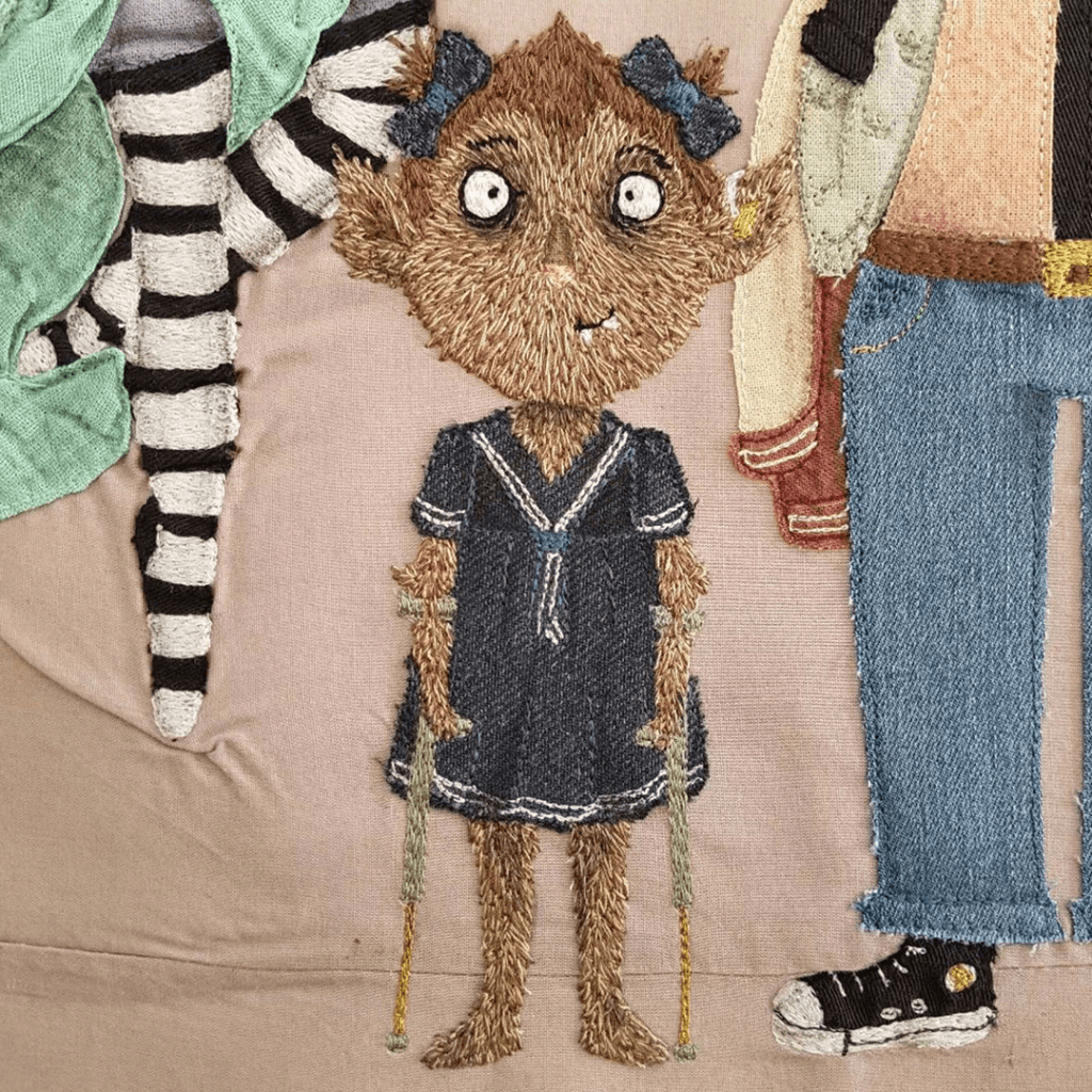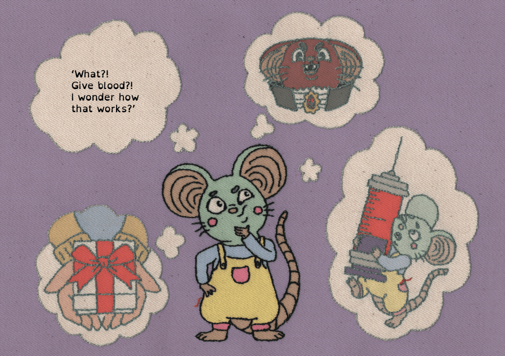 The spreads were then outlined in hand controlled free machine stitch, before being scanned and digitally coloured by hand. I continue to choose to work in textiles and stitch, due to our comforting relationship with them. Their haptic properties help to physically and visually soften a world and topic that might be otherwise scary for young readers.