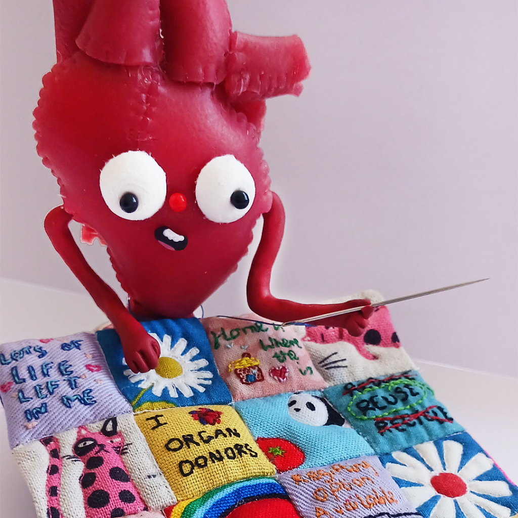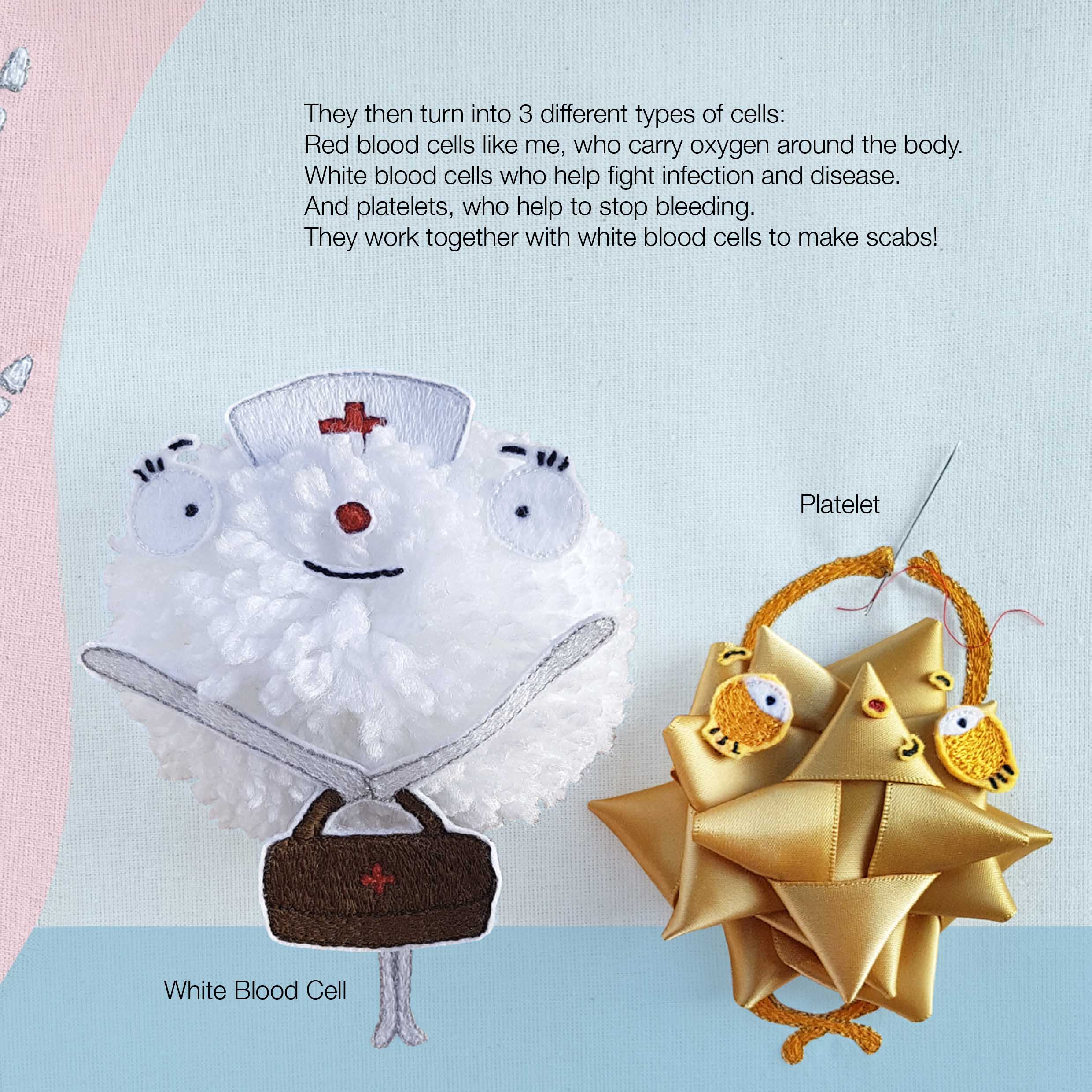 Taking 2D illustration and moving into 3D objects ranging from soft plushies to clay. The Chloe doll (image 4) and Cecil (image 5) were created to work alongside ‘Chloe’s New Stem Cells’. The doll utilises magnets to allow for interchangeable facial expressions and hair to move through Chloe’s medical experiences. ‘Artie’ from image 3 is made from materials developed to mimic muscle for healthcare practitioners to test their surgery skills!