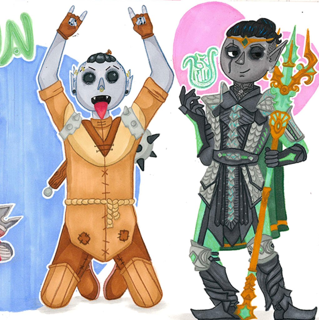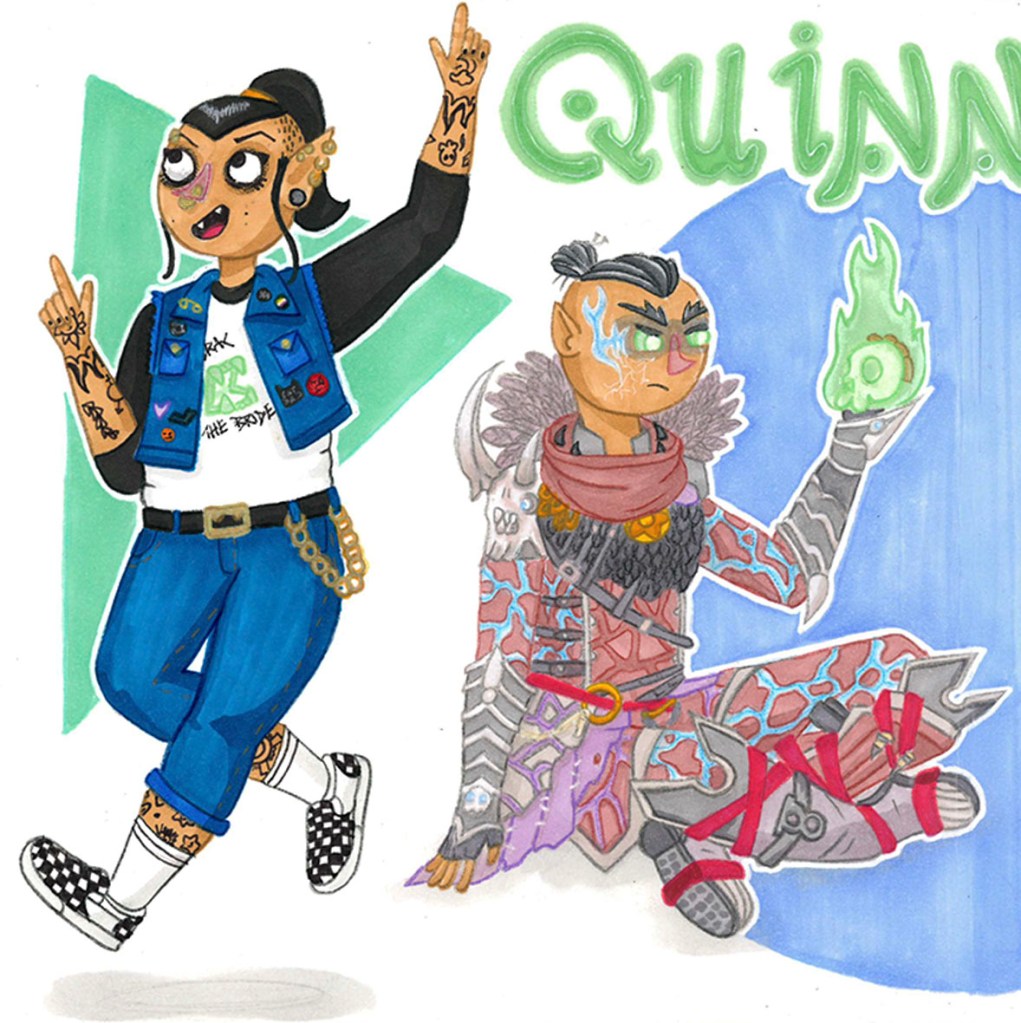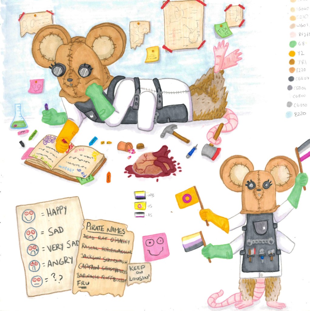 Take a nosey through my sketchbook, a place where I play and develop through trying new materials, such as alcohol markers, acrylic pens, and acrylic ink. I enjoy focusing on character creation and just having fun! A lot of the characters have been created through playing tabletop roleplaying games such as Dungeons & Dragons and The Wildsea.