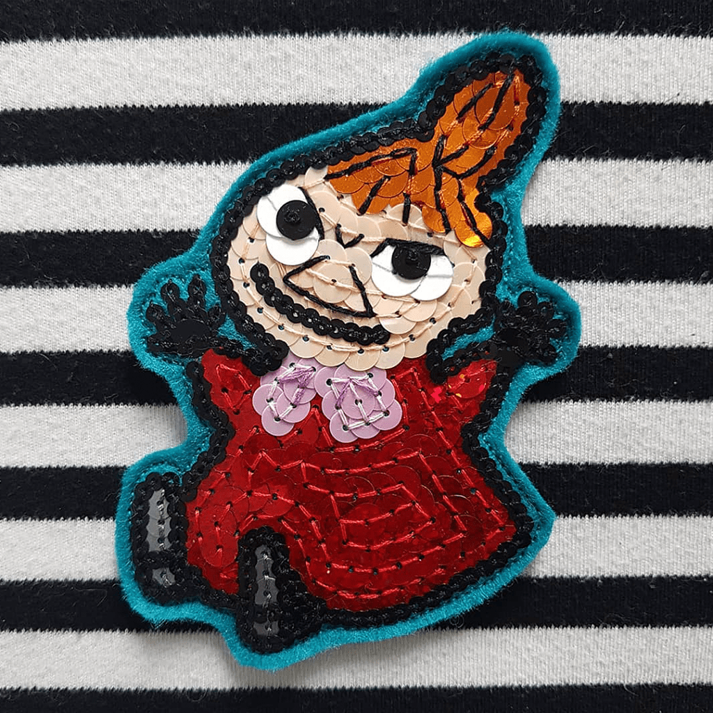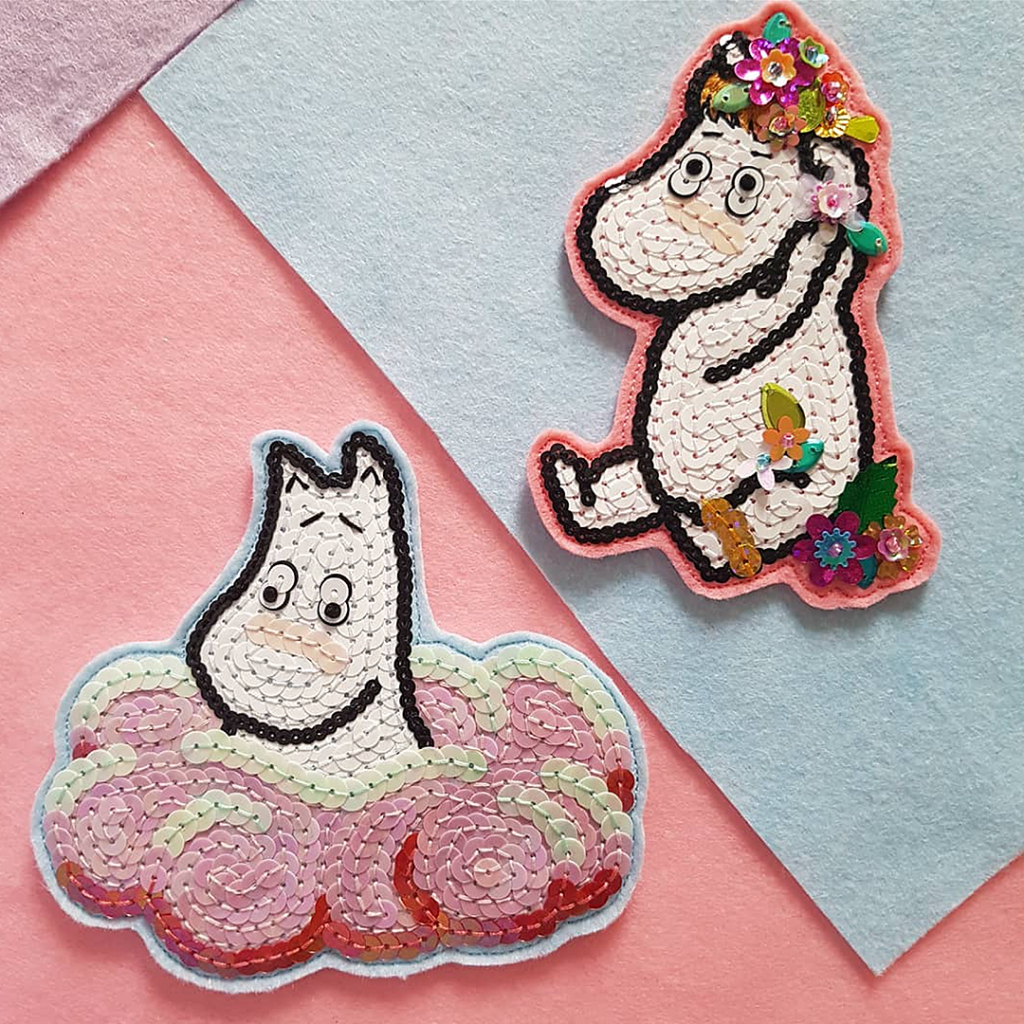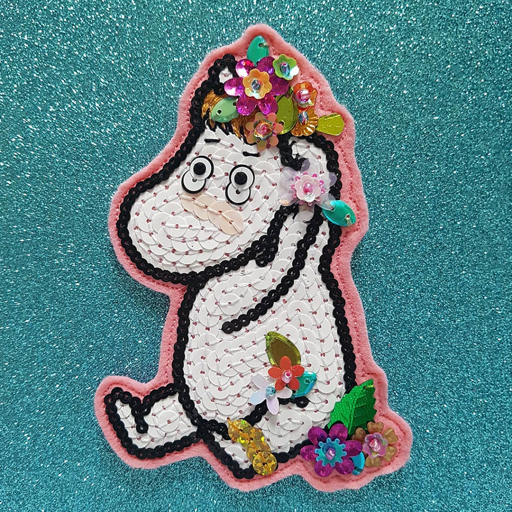Hand sequinned patches of favourite Moomin characters, including a glow in the dark hattifattener!