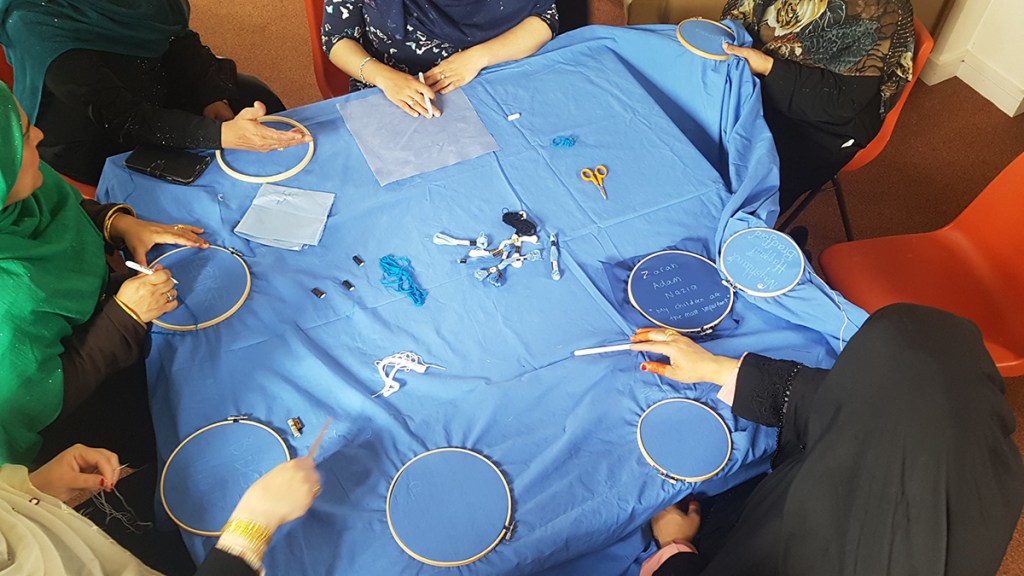 ‘Blue Plaques of Intangible Experiences’ involved working with groups of people to support them to produce their own creative stitch-based work. Three groups of people from two different community centres in inner city Bradford will took part in the workshops to develop their own ‘blue plaques’ in response to positive and often intangible aspects of neighbourliness experienced in their local community. Working with University of Huddersfield, Dr Claire Barber and curator June Hill.